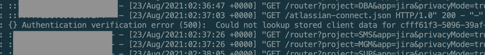 {} Authentication verification error (500): Could not lookup stored client data for XXX
